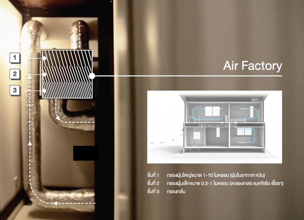 ระบบ Air Factory System ของเอสซีจี ไฮม์ มีตัวกรองอากาศ 3 ชั้น เพื่อกรองอากาศให้สะอาด ก่อนนำมาหมุนเวียนภายในบ้าน